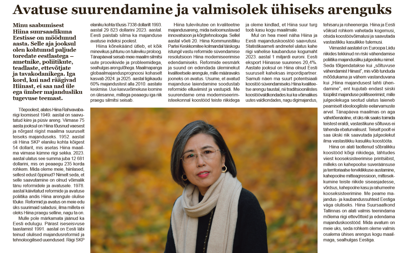 Ambassador Guo Xiaomei's Article Titled "Keep opening up and embrace shared development" published in Estonian Newspaper Õhtuleht